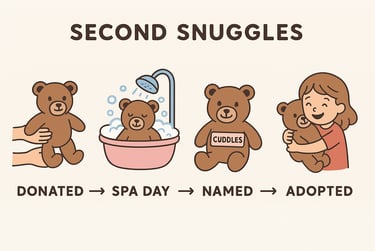 In a world overflowing with fast-fluff (mass-produced plush toys made quickly and cheaply), many once-loved companions are discarded before their stories are finished. Donation centers are overwhelmed, shelves overflow, and sadly, many stuffies end up in landfills. Second Snuggles offers a kinder, more sustainable alternative.